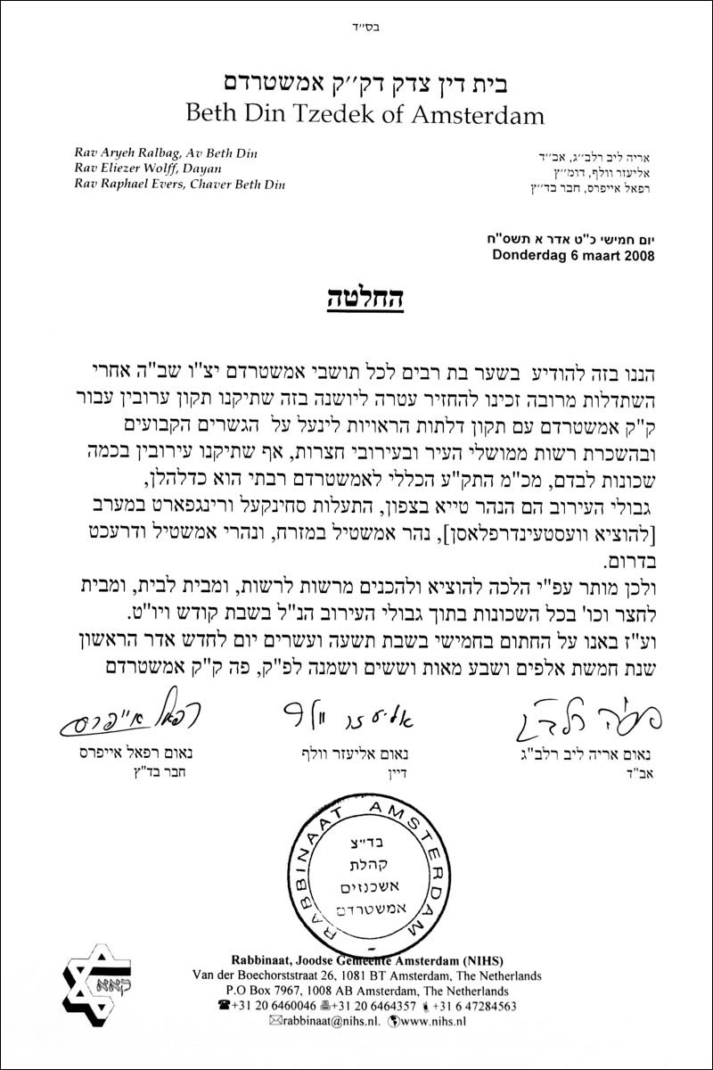 Vervolgens heb ik maandenlang nacht na nacht gewerkt aan een manuscript, een responsa, waarin ik het hele plan tot in detail noteerde. Ik leverde de ideeën en een vertrouweling, de heer Maarsen, typte het uit. Die responsa heb ik verstuurd naar diverse experts op dit gebied. Een enkeling durfde er zijn handen niet aan branden, maar iedereen die wilde meewerken, kwam tot dezelfde conclusie: dit plan voldoet aan de Joodse wet.