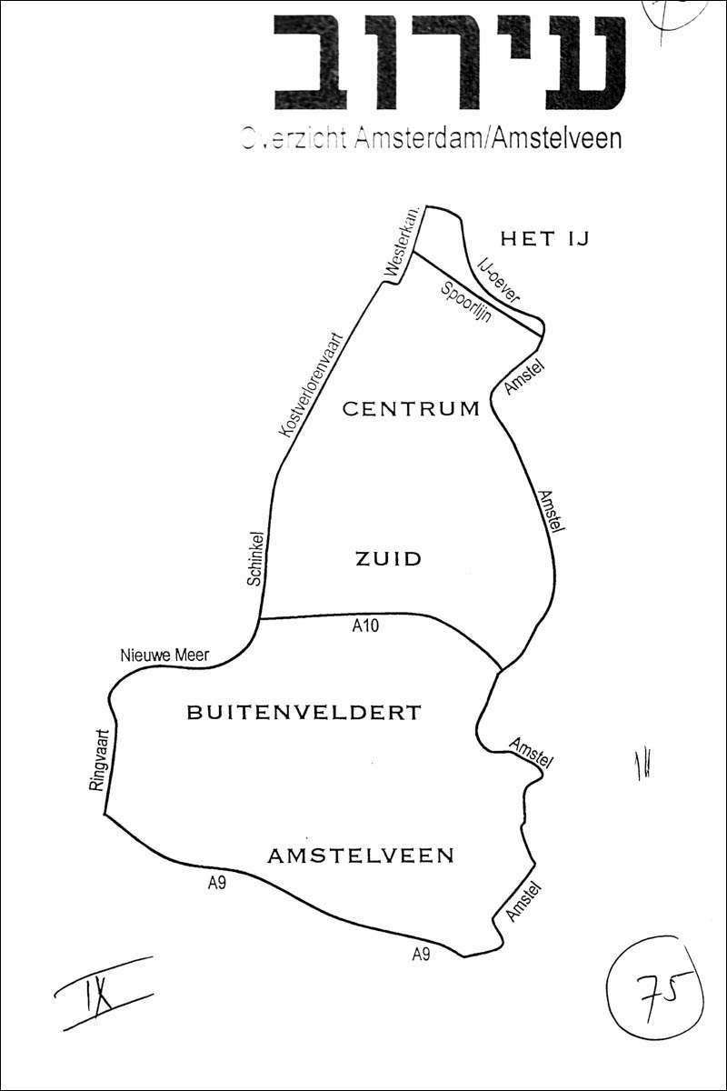 En ik moest nog één ding goed uitzoeken: hoe het zit met een andere grens die op sabbat geldt: de loopgrens. Kort gezegd komt die erop neer dat je op sabbat niet verder de bebouwde kom uit mag lopen dan 960 meter. In de tijd dat we de eroev ontwierpen, was er een stuk braakliggend terrein tussen Amstelveen en Uithoorn. Als de afstand tussen die twee te groot zou zijn, had dat betekend dat je daar wel mocht dragen maar niet lopen, wat een onwenselijke paradoxale situatie zou opleveren. Ik ben bij de gemeente Amstelveen achter grote computerschermen gaan kijken hoe de huizengrenzen liepen en het bleek precies te kunnen, bijna op de meter nauwkeurig. En zo werd de huidige eroev een feit. Het is een van de grootste ter wereld. En héél veel groter had hij niet mogen zijn: volgens de geleerden zou je de grenzen moeten kunnen zien als je op het middelpunt van het gebied op een verhoging staat. Dat komt neer op een straal van ongeveer 15 km, en daar voldoet deze eroev aan.